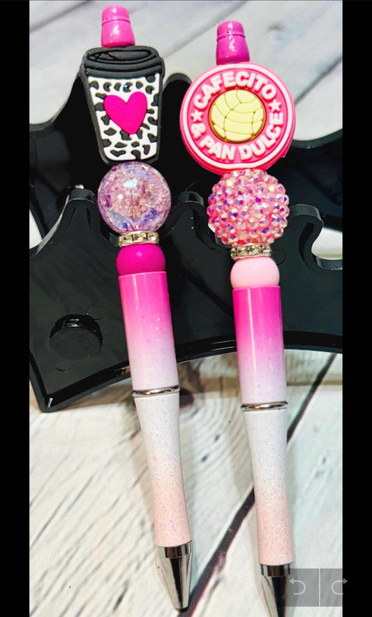cafecito beaded pen, pan dulce beaded pen, cute glitter pen for teachers, pink ombre pen with charm, refillable twist pen gift