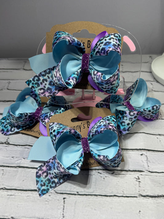 Blue and purple leopard print hair bow, Boutique handmade girls hair bow, Animal print toddler hair accessory, Sparkly purple center hair bow clip
