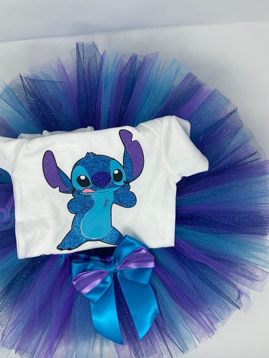 custom Stitch birthday outfit girl/personalized glitter tutu set/Stitch themed birthday outfit toddler/birthday outfit with name and character.