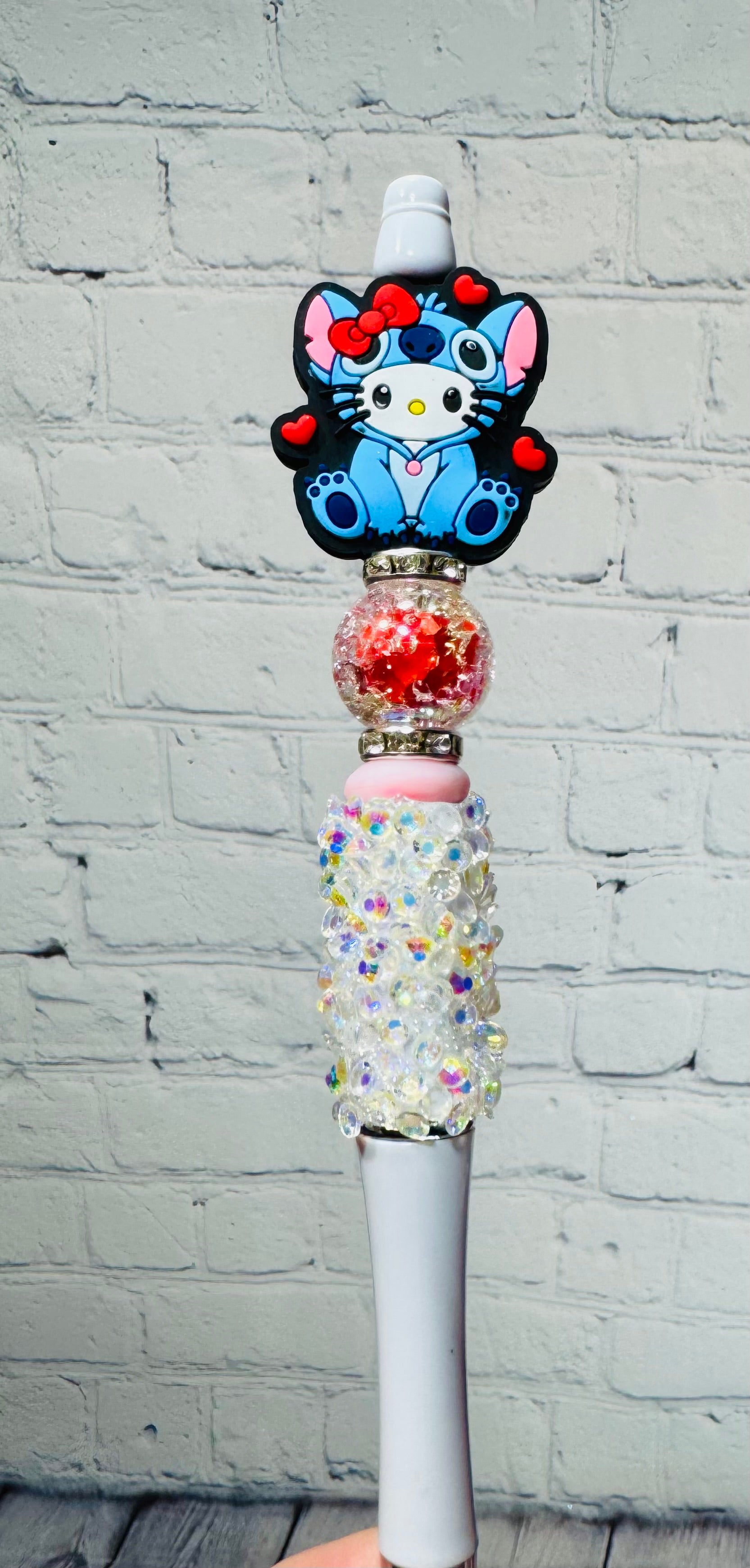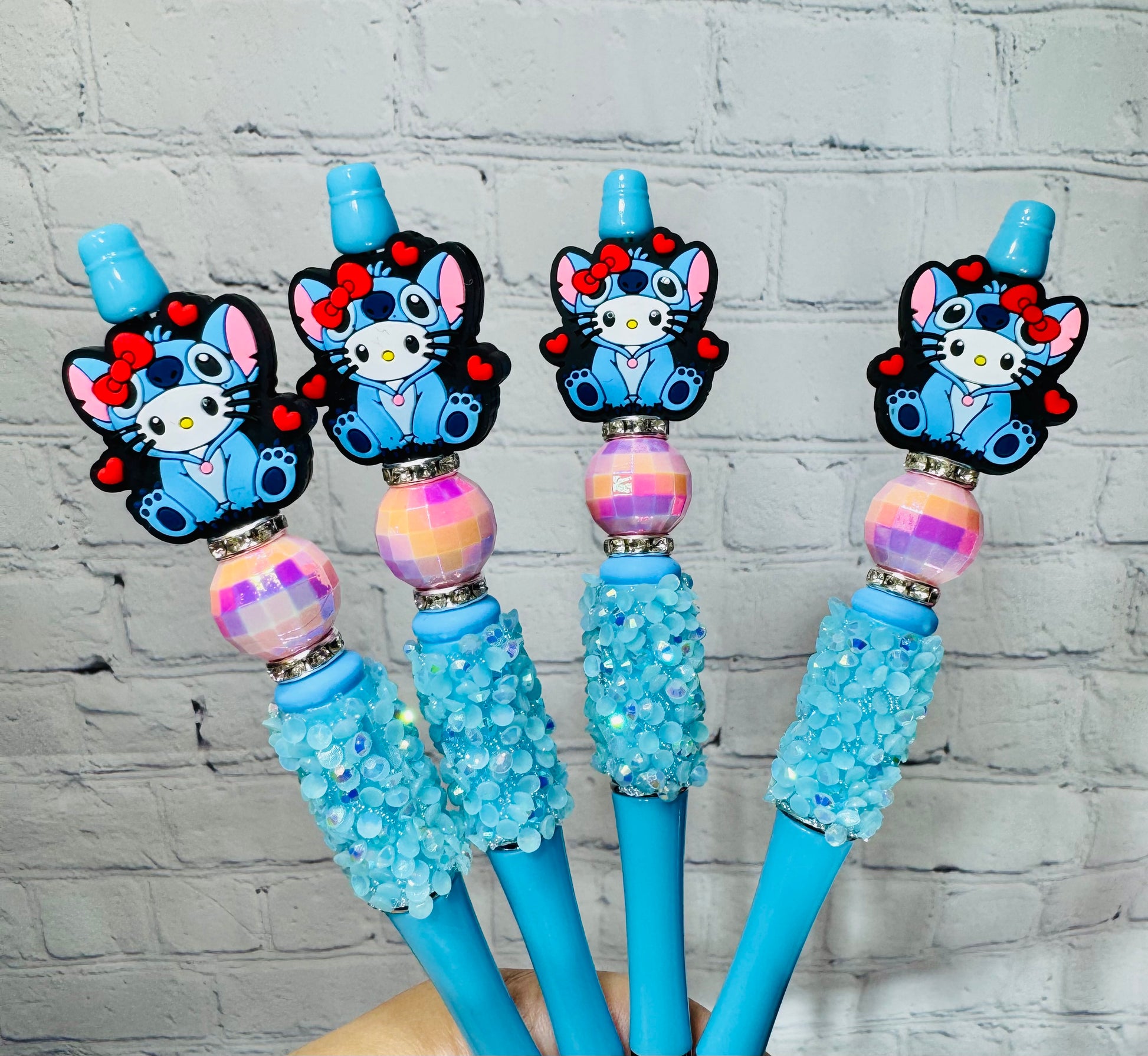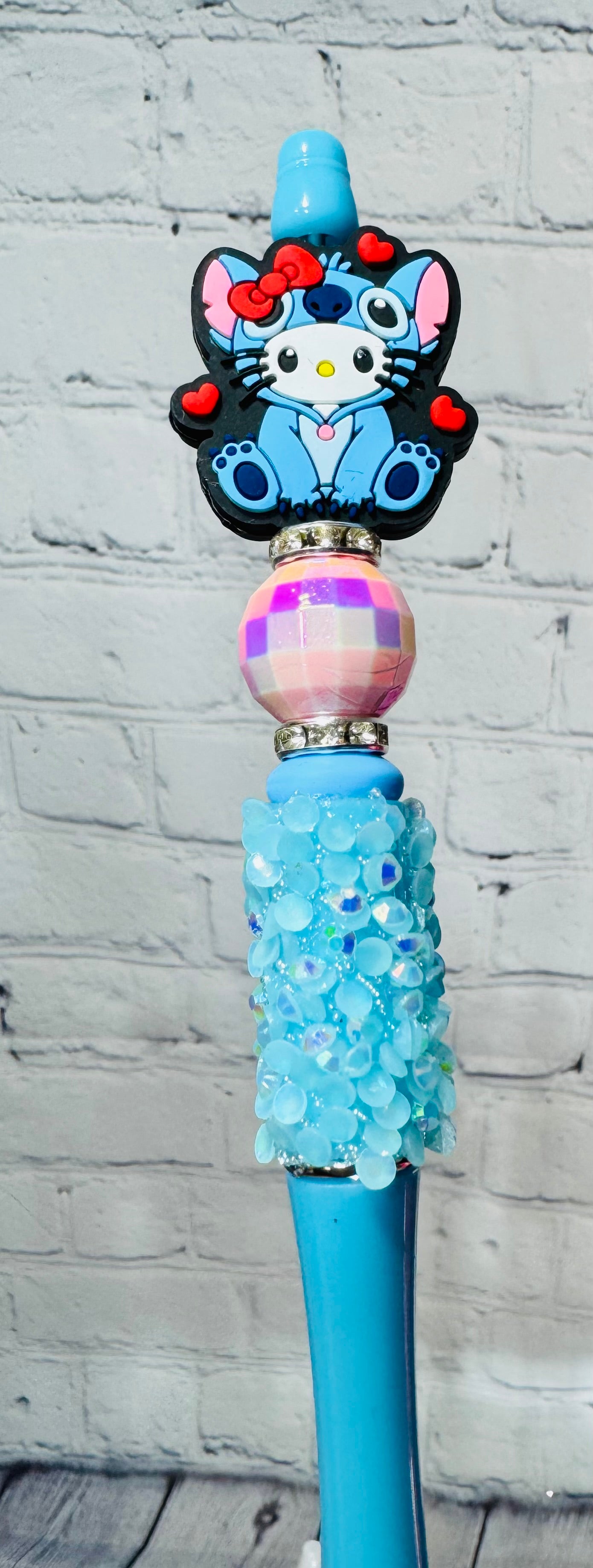 Beaded pen with stitch costume kitty, Cute kitty in Stitch-Outfit beaded pen,custom stitch-inspired kitty bead pen, Blue alien costume bead