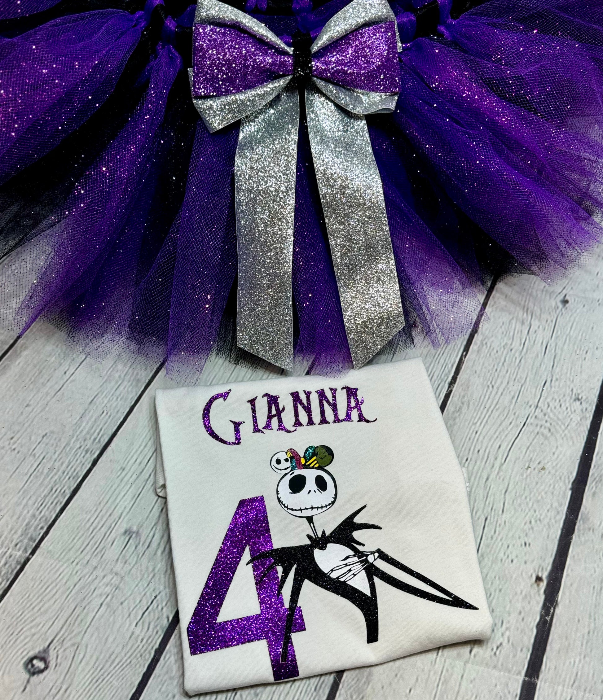 Make your little one’s birthday spooktacular with this Nightmare-Inspired Tutu Outfit! Featuring a glittery, personalized shirt and a stunning purple and black tulle tutu with a sparkling silver bow, this set is perfect for any fan of spooky fun.
