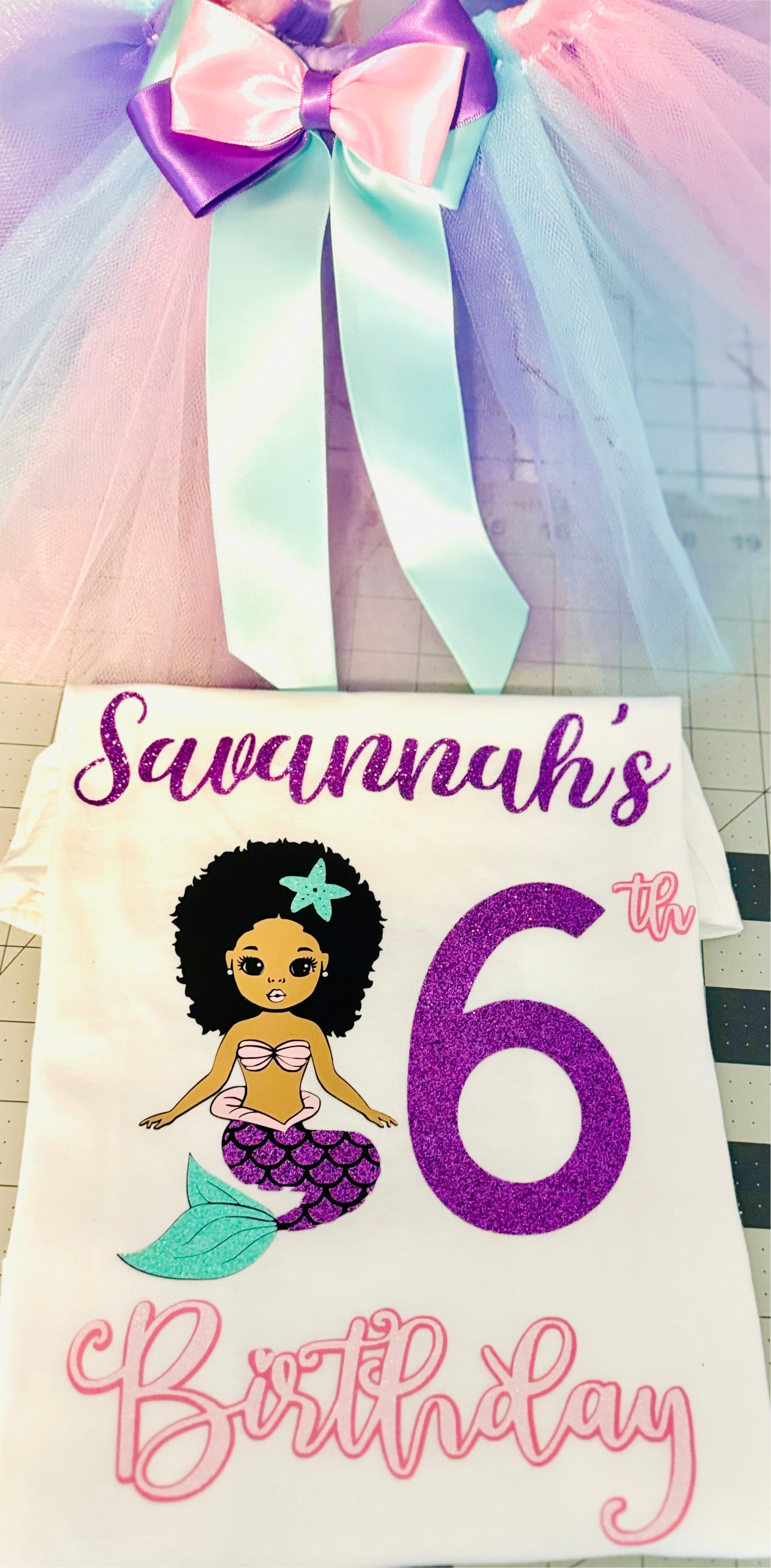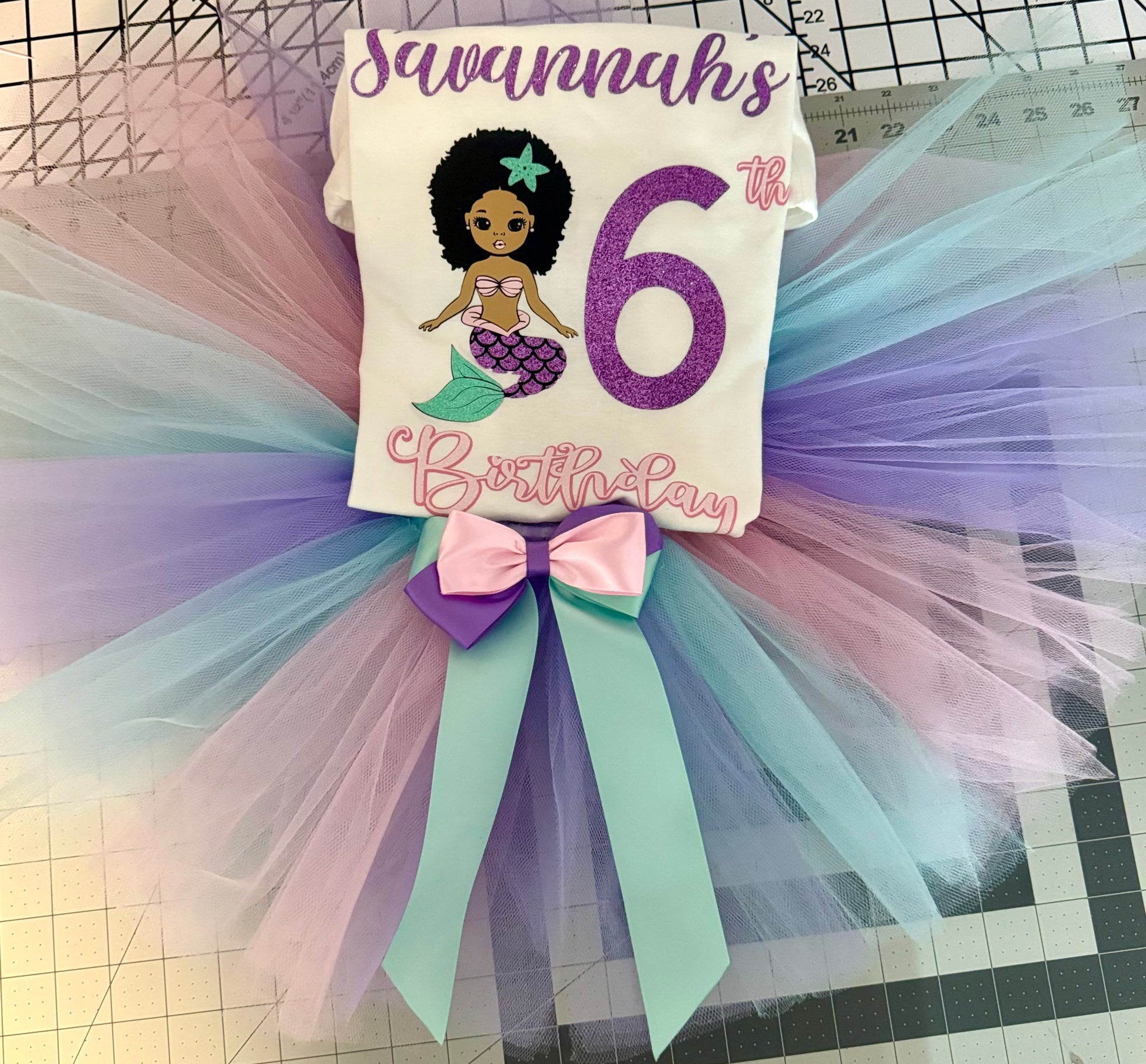 Introducing the perfect ensemble for your little one's special day: the Mermaid Birthday Outfit. This adorable set features a personalized toddler birthday shirt adorned with a charming mermaid design, ensuring your child stands out at their mermaid-themed party. Paired with a vibrant, multi-color mermaid party tutu, this outfit is ideal for any girl who dreams of being a mermaid princess. Perfect for an "Under the Sea" celebration, this mermaid tutu set will make your child's birthday magical and memorable.
