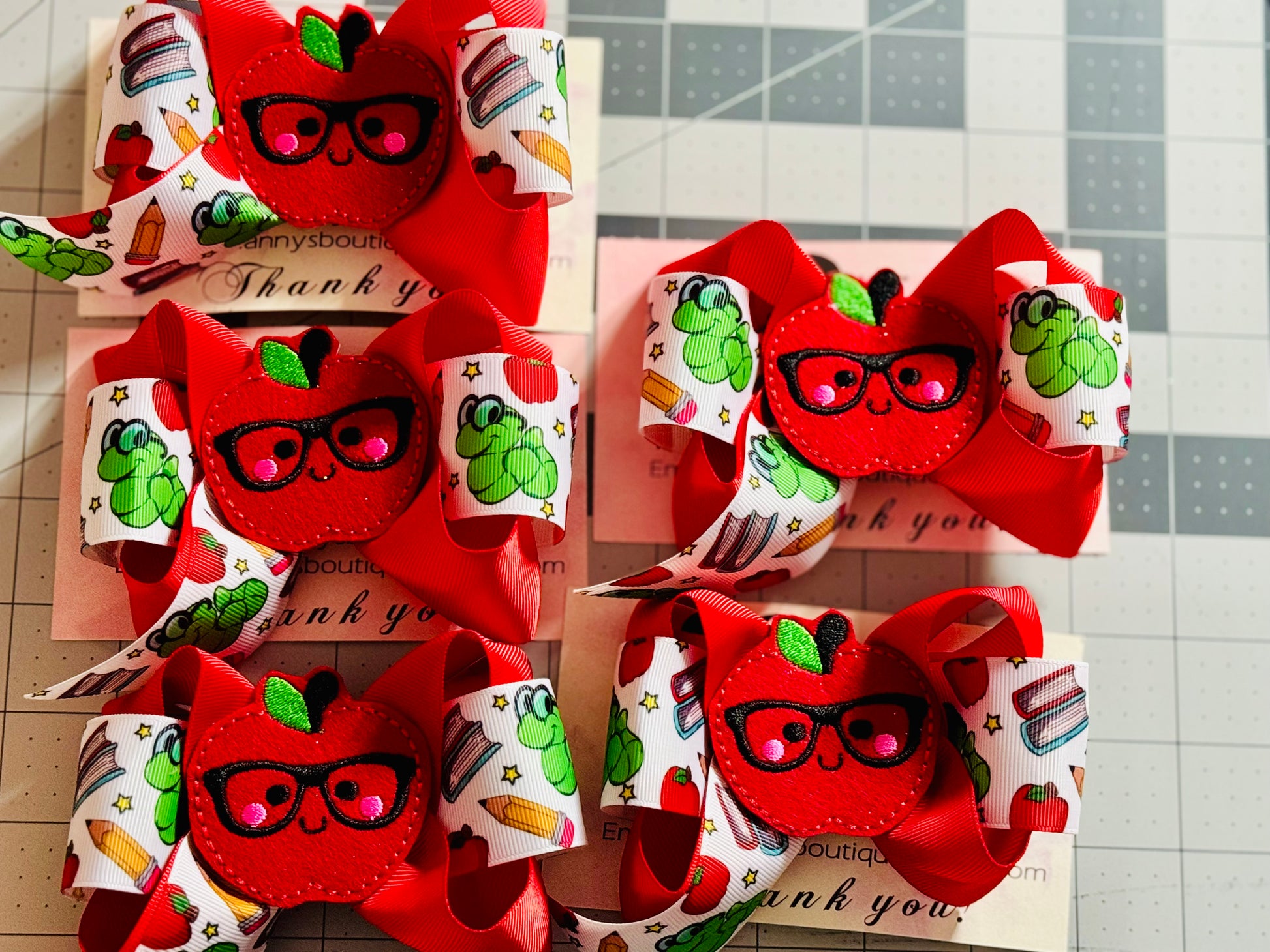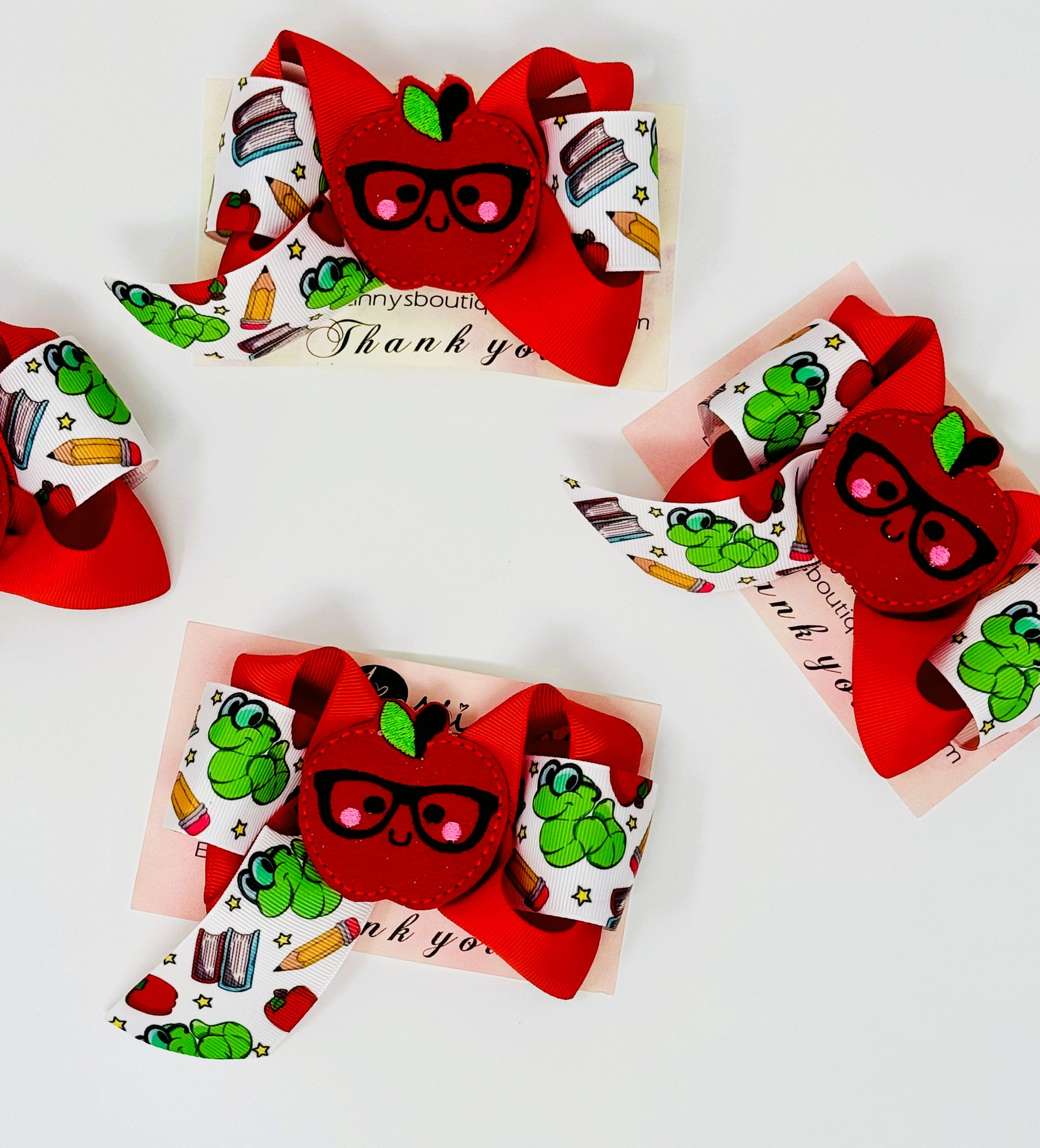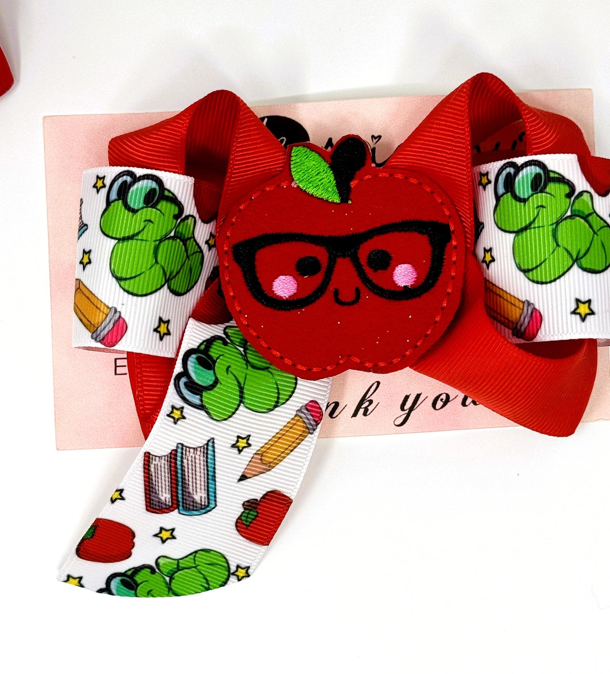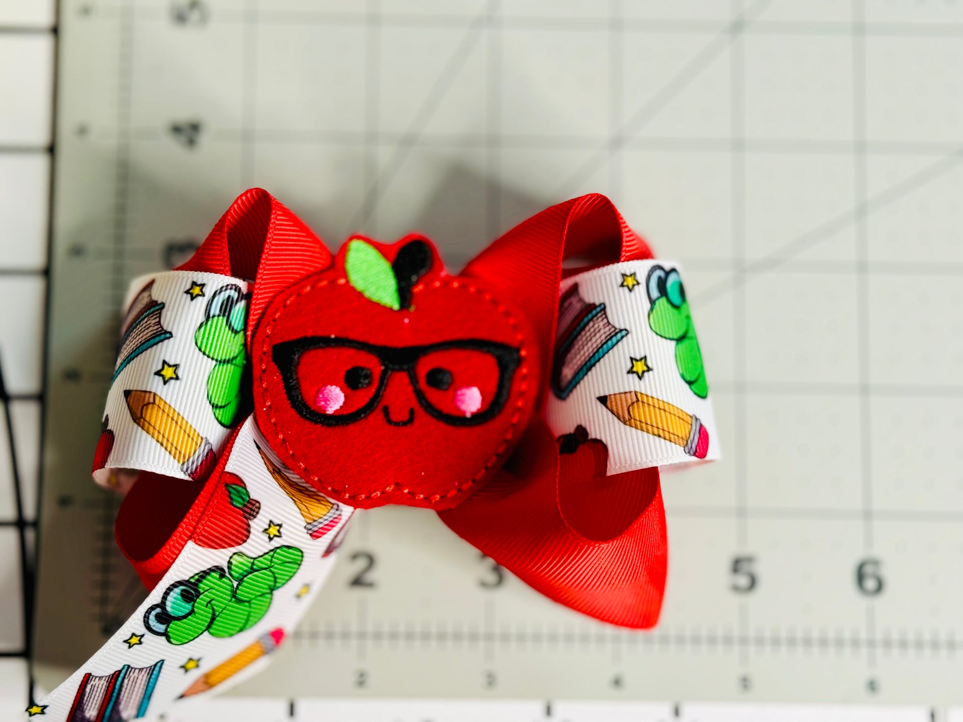 Cute boutique hairbow with apple feltie, perfect for back to school. This item is ready to ship! Only a few left, order yours today!