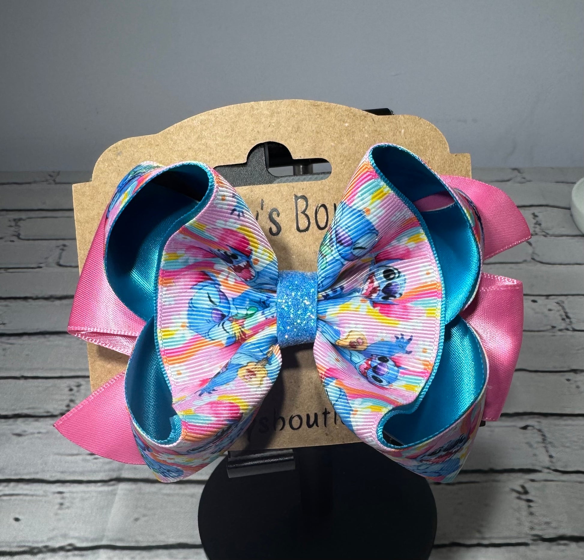Stitch inspired rainbow hair bow,Colorful cartoon character bow for girls,Handmade Disney trip hair accessory,Large glittery bow for toddler