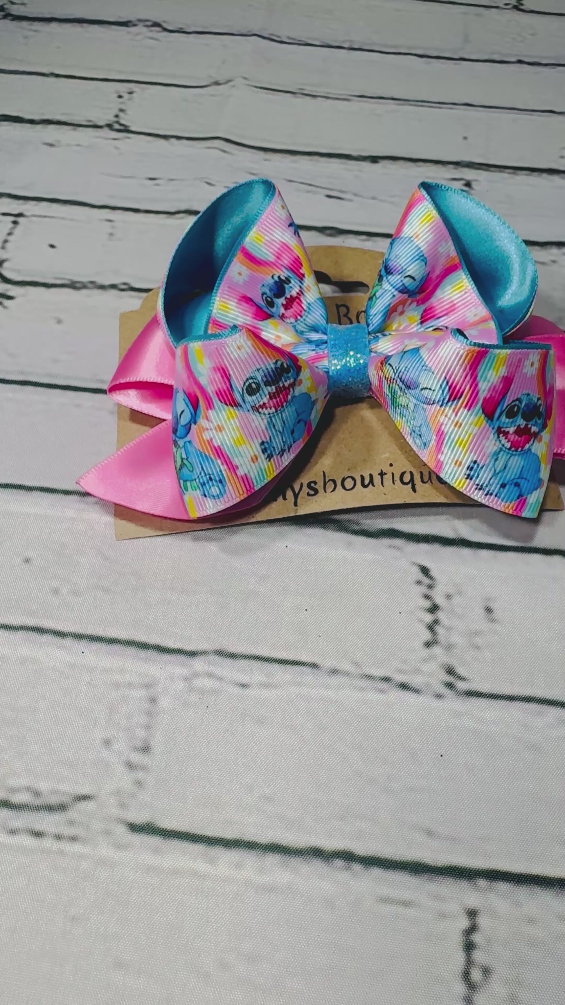 Add a splash of vibrant fun to your little one’s outfit with our Colorful Stitch-Inspired Hair Bow! This handcrafted bow features a delightful rainbow-striped ribbon adorned with cute Stitch characters, paired with shimmering turquoise and bubblegum pink layers for extra flair. The center is wrapped in glittery blue for that extra sparkle that catches the light just right. Whether for a birthday, Disney trip, or everyday magic, this bow is the perfect accessory to make any hairstyle pop with personality!